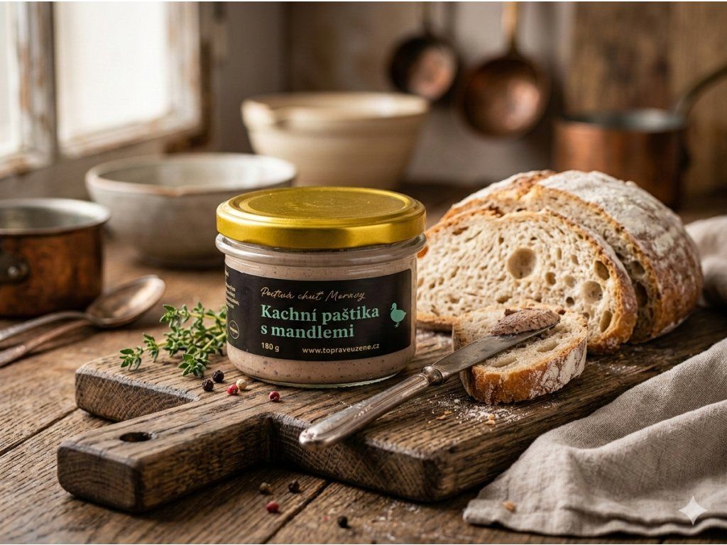 Jemná chuť paštiky s přidáním nasekaných mandlí dodává paštice nezaměnitelnou chuť.