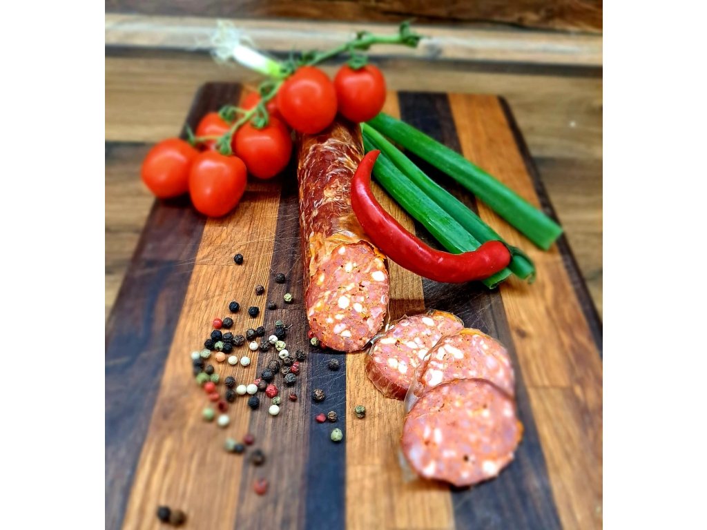 Vyzkoušejte náš paprikový salám – delikatesu vyrobenou dle státních norem z roku 1976. Kombinace 80 % vepřového a 20 % hovězího masa s paprikou, česnekem a kmínem nabízí šťavnatou texturu a bohatou chuť. Jeden kus váží cca 800–850 g a je vakuově balen pro maximální čerstvost.