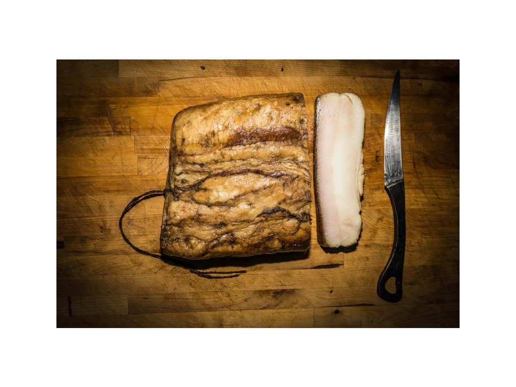 Objevte Pravý uzený špek – plátky šťavnatého vepřového tuku pomalu uzené nad bukovým dřevem.