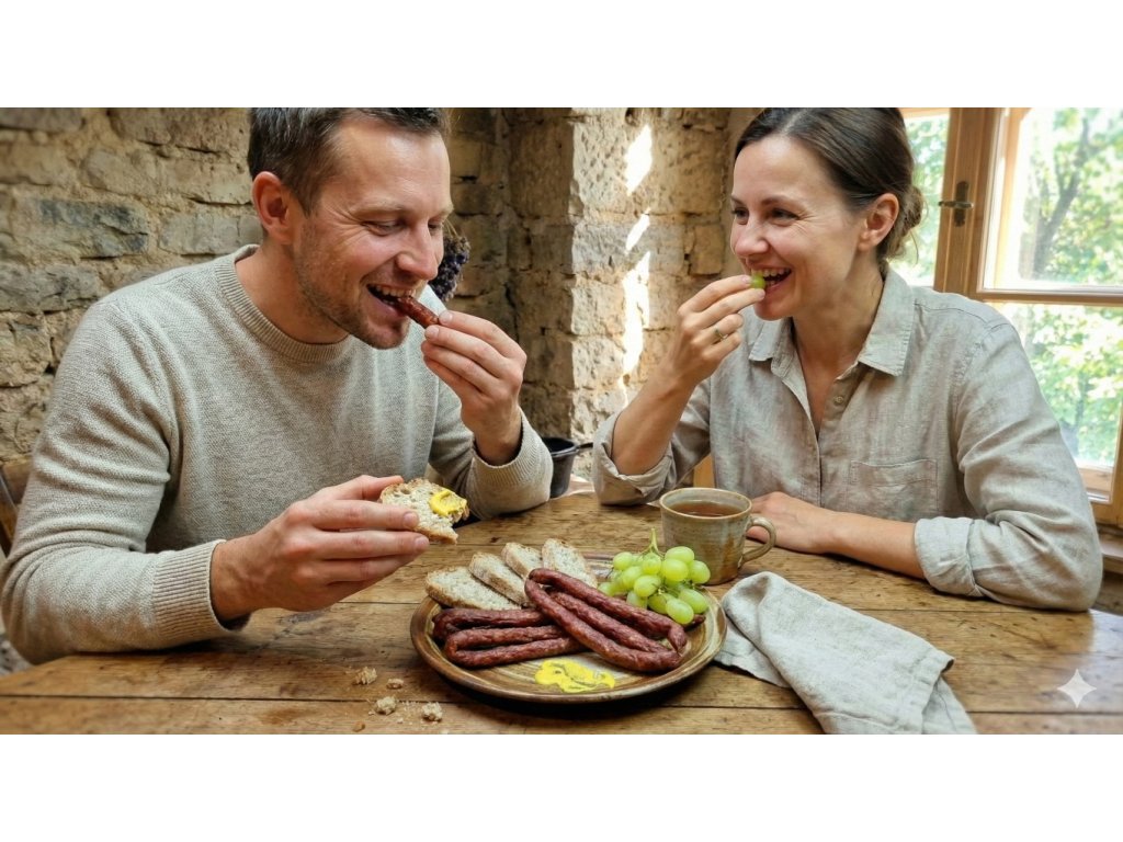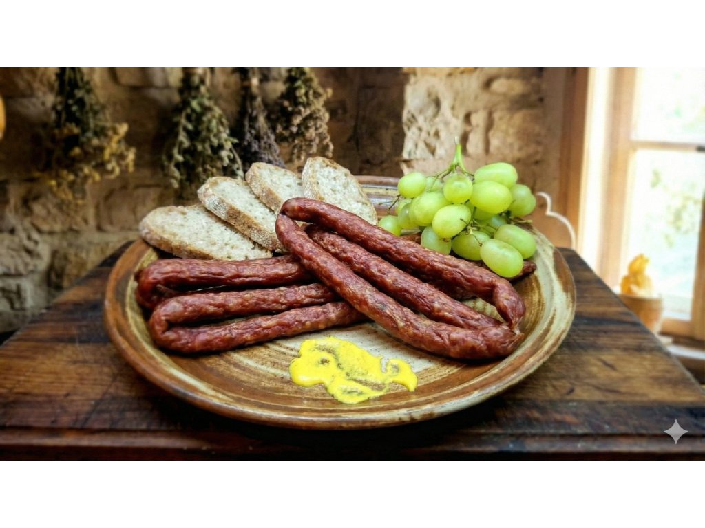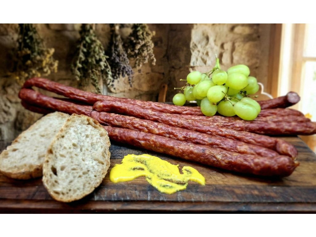- Složení: 70 % vepřové maso, 30 % hovězí maso, jedlá sůl, směs přírodního koření.